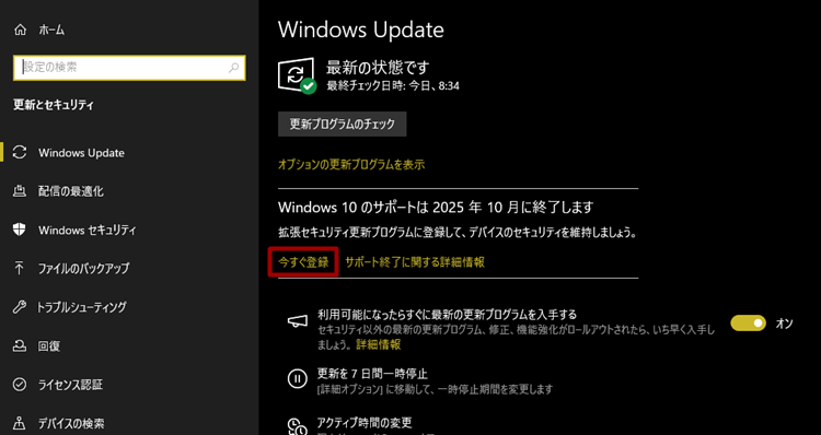 Windows Updateのページで、「Windows 10 のサポートは2025年10月に終了します」と表示されているところのすぐ下の「今すぐ登録」をクリックします。