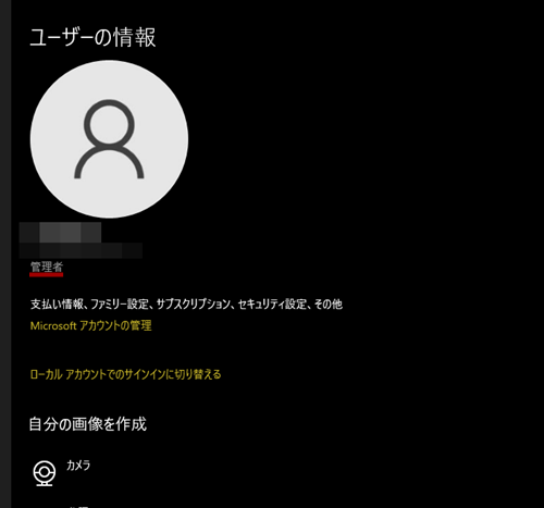 - サインインしているマイクロソフトアカウントが管理者となっている