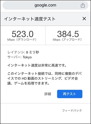 ドコモ光の時でも、下りで400Mbps出ていて早いと思っていたんだけど・・・。