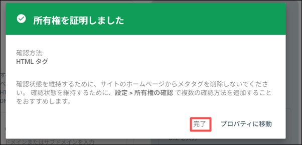 「所有権を証明しました」という画面が表示されたら、サーチコンソールの登録はOK。