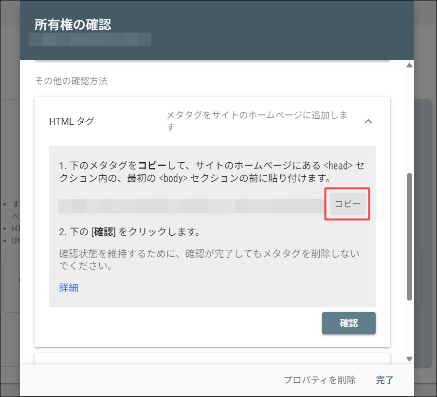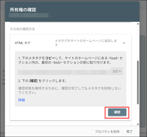 所有権の確認では、HTMLタグをサイトに貼りつけるのが簡単なので、おすすめです。