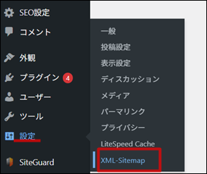 ワードプレスの管理画面を開き、「設定」にマウスポインタを合わせ、「XML-Sitemap」をクリック。