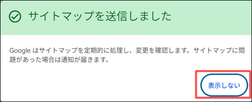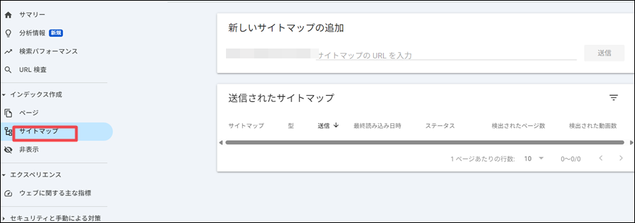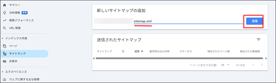 サーチコンソールの先ほどの画面に戻り、「新しいサイトマップの追加」のところに